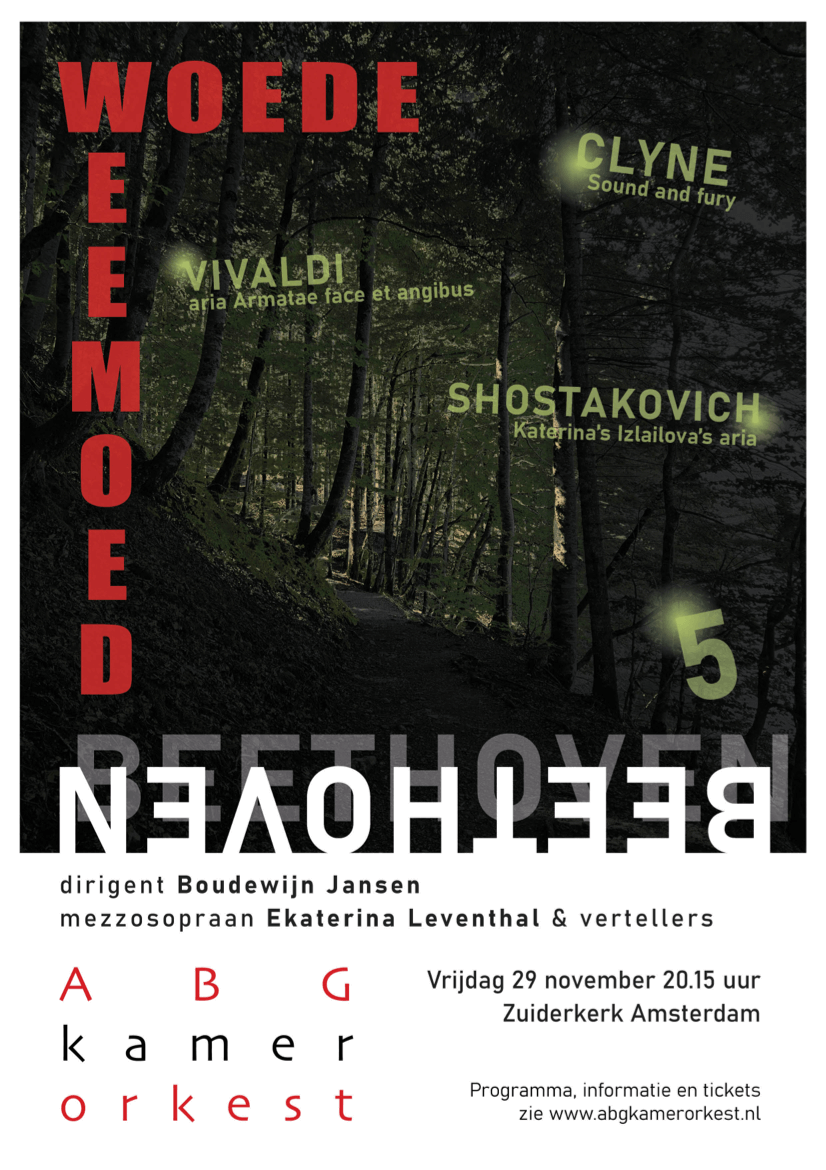 Beethoven 5 staat centraal, maar in een verrassende volgorde. De zeggingskracht van ieder deel wordt versterkt door werken van Antonio Vivaldi, Anne Clyne, Dmitri Shostakovich en Krzystof Penderecki, en korte gesproken bespiegelingen over woede, weemoed en berusting. Een concert van het ABG Kamerorkest, met dirigent Boudewijn Jansen, mezzosopraan Ekaterina Leventhal en vertellers.